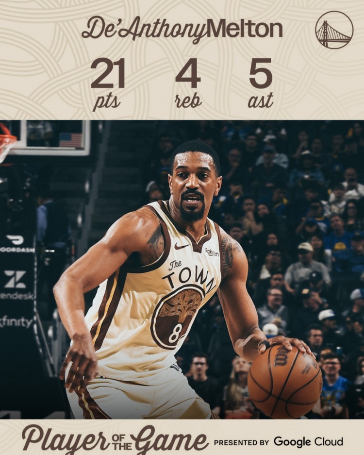 本场比赛,勇士后卫梅尔顿高效发挥,出场28分钟12投7中,三分6中4、罚球5中3拿到21分4篮板5助攻,正负值-1。末节梅尔顿贡献7分。