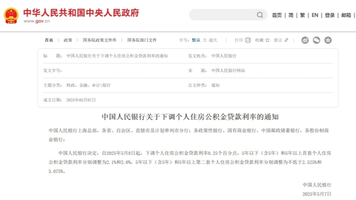 根据2025年5月7日发布的《中国人民银行关于下调个人住房公积金贷款利率的通知》,自2025年5月8日起,下调个人住房公积金贷款利率0.25个百分点,5年以下(含5年)和5年以上首套个人住房公积金贷款利率分别调整为2.1%和2.6%,5年以下(含5年)和5年以上第二套个人住房公积金贷款利率分别调整为不低于2.525%和3.075%。